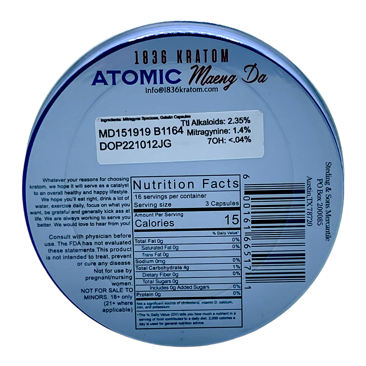 The 1836 Atomic Maeng Da Jumbo Capsules feature a bold Maeng Da blend that brings together multiple vein varieties into one full-spectrum profile. Each capsule contains 1 gram of premium kratom powder, offering a convenient way to enjoy this versatile strain without measuring or mixing powders.