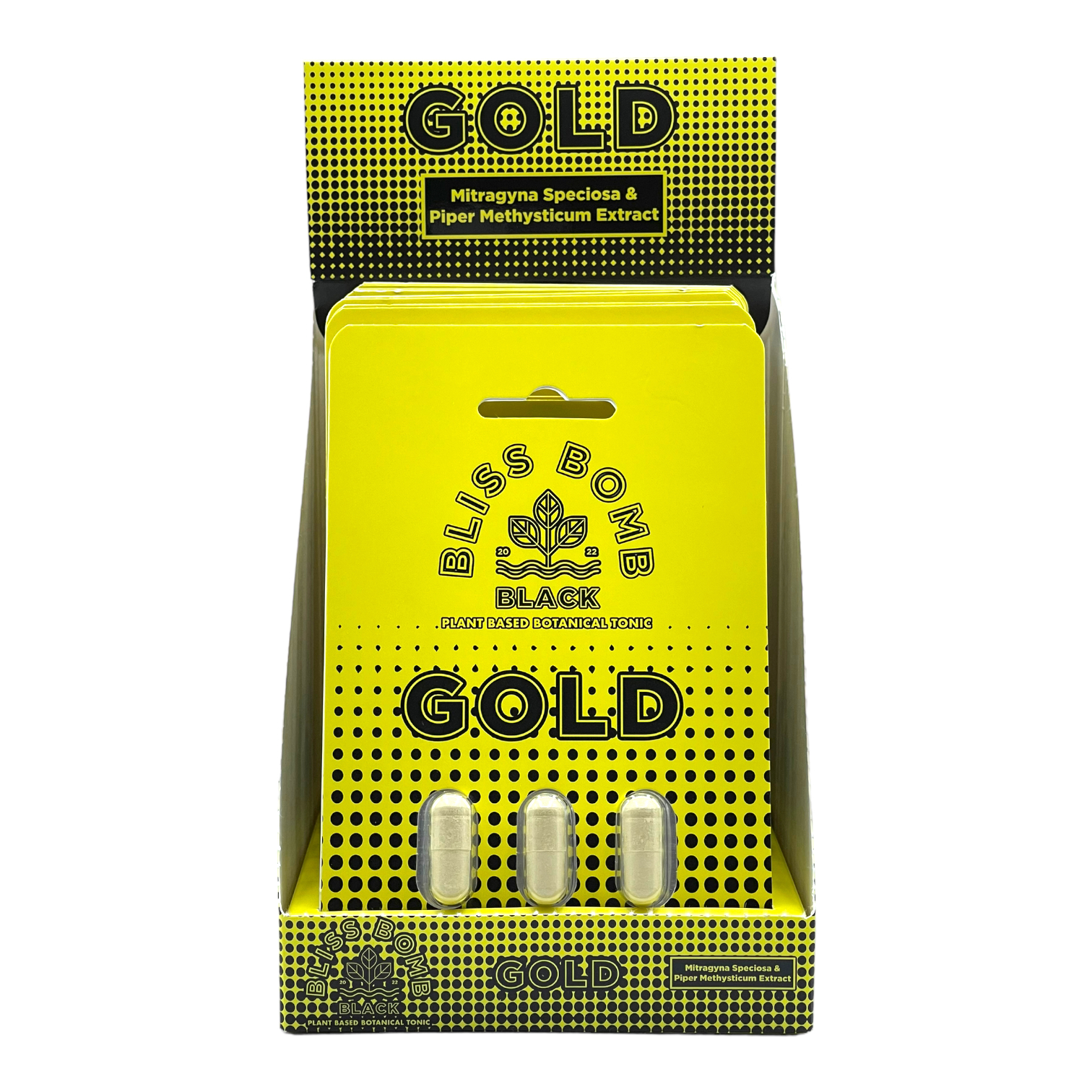 Discover the unparalleled power of Bliss Bomb Gold Capsules, a revolutionary product in the world of plant-based botanicals. Each capsule is packed with 100mg of kavalactones and 100mg of mitragynine, making it a go-to choice for those seeking relaxation, energy, and focus all in one.