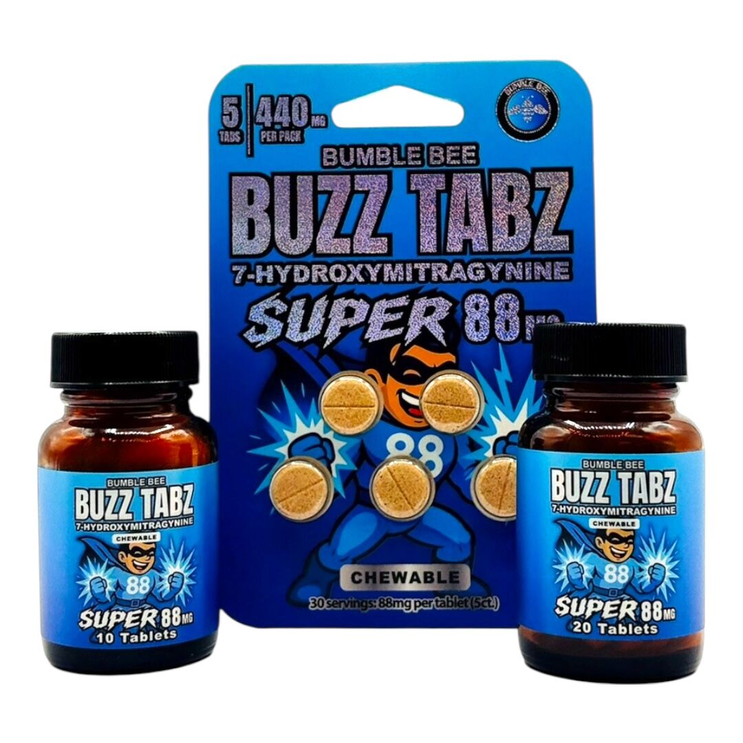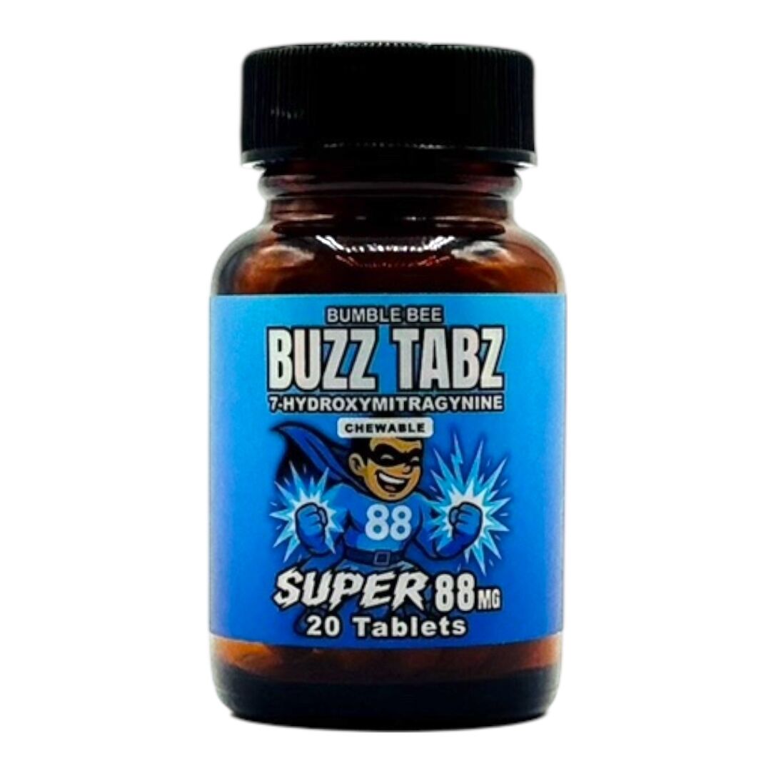 Bumble Bee BUZZ TABZ Super 88 Tablets are presented as a specialty collector’s edition. Each tablet contains 88mg of 7-hydroxymitragynine (7-OH) and is available in multiple bottle sizes for organized cataloging and storage. These tablets are intended strictly for botanical research, collection, and reference purposes and are not intended for human consumption.