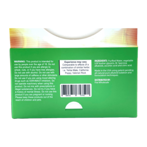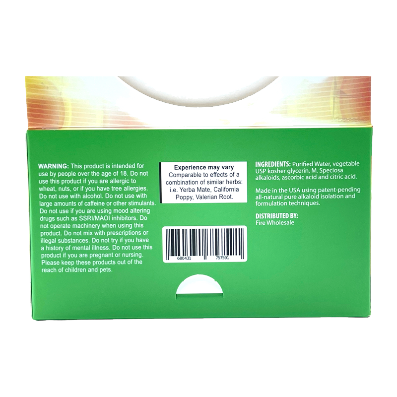 Ingredients: Purified Water, Vegetable USP Kosher Glycerin, Mitragyna Speciosa Extract, Ascorbic Acid, Citric Acid