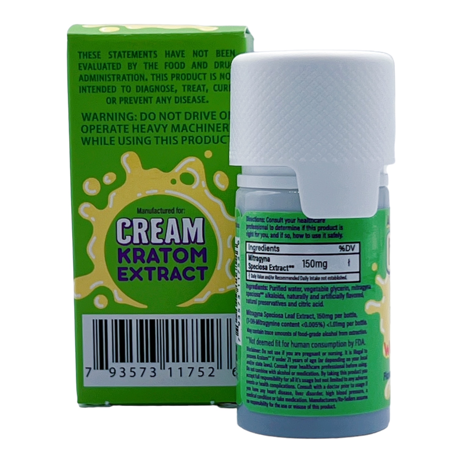 Cream Kratom Watermelon Ice Shot combines the cooling taste of watermelon with a concentrated kratom extract in a convenient 30mL format. Each bottle contains 150mg of Mitragyna speciosa extract, offering a smooth and flavorful option for those who prefer kratom in liquid form.