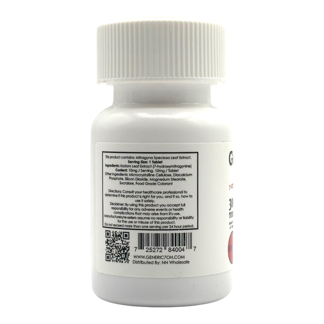 Generic RX 7-OH Cherry Tablets bring strength and simplicity together in one clean format. Each bottle contains 30 tablets, with 10mg of 7-hydroxymitragynine per tab, giving you a total of 300mg per bottle. Designed for adults only, these tablets offer a consistent, pre-measured option without the mess of powders or uncertainty of extracts.