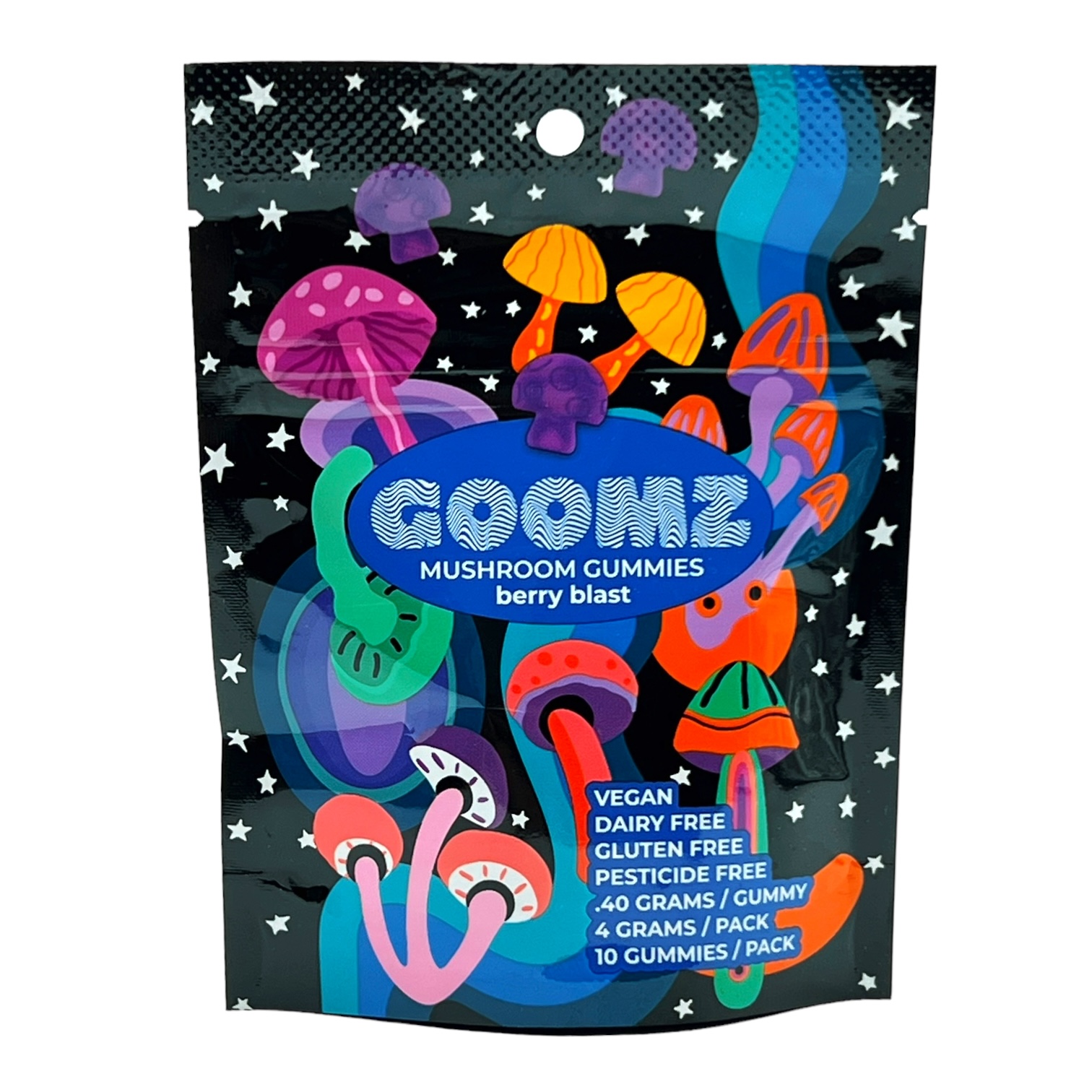 Goomz Mushroom Gummies Berry Blast are presented in gummy form with a berry-inspired flavor profile. This product is packaged for collectors and researchers interested in botanical references.
