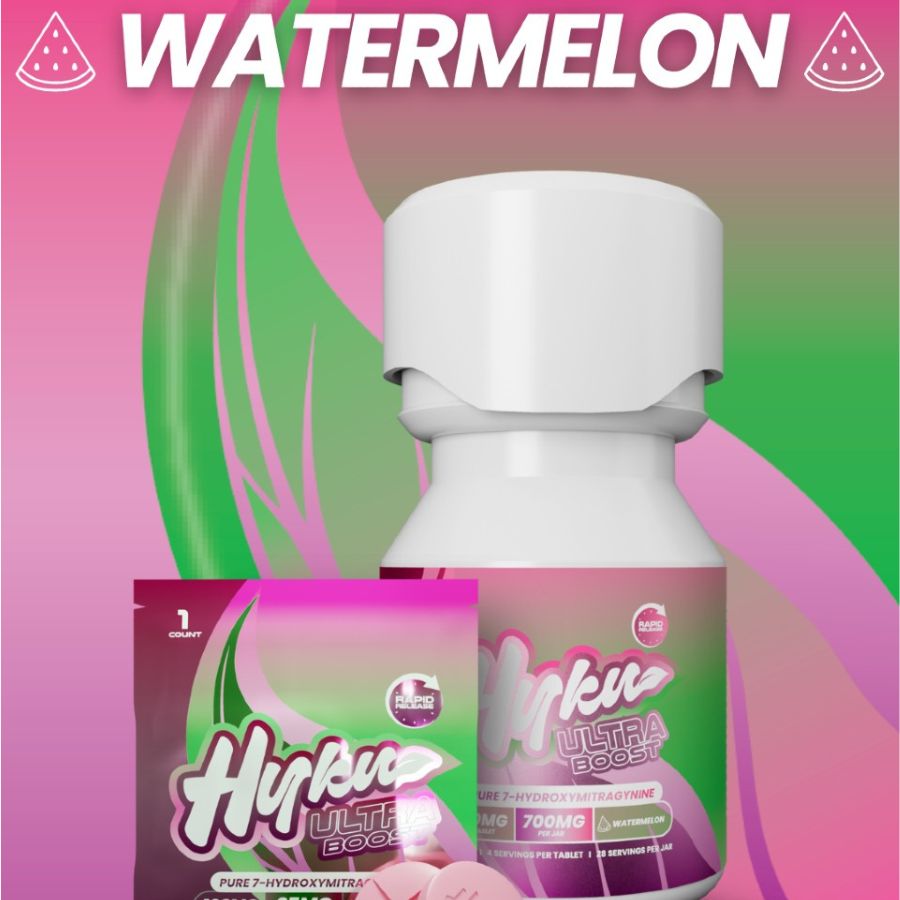 Hyku Ultra Boost Pure 7-OH Tablets – 100mg deliver maximum strength in a compact, chewable format. Each tablet contains 100mg of 7-hydroxymitragynine, scored into four 25mg servings for flexible use. Designed for experienced users, these tablets combine high potency with a flavored chewable base that eliminates the bitterness found in raw extracts.