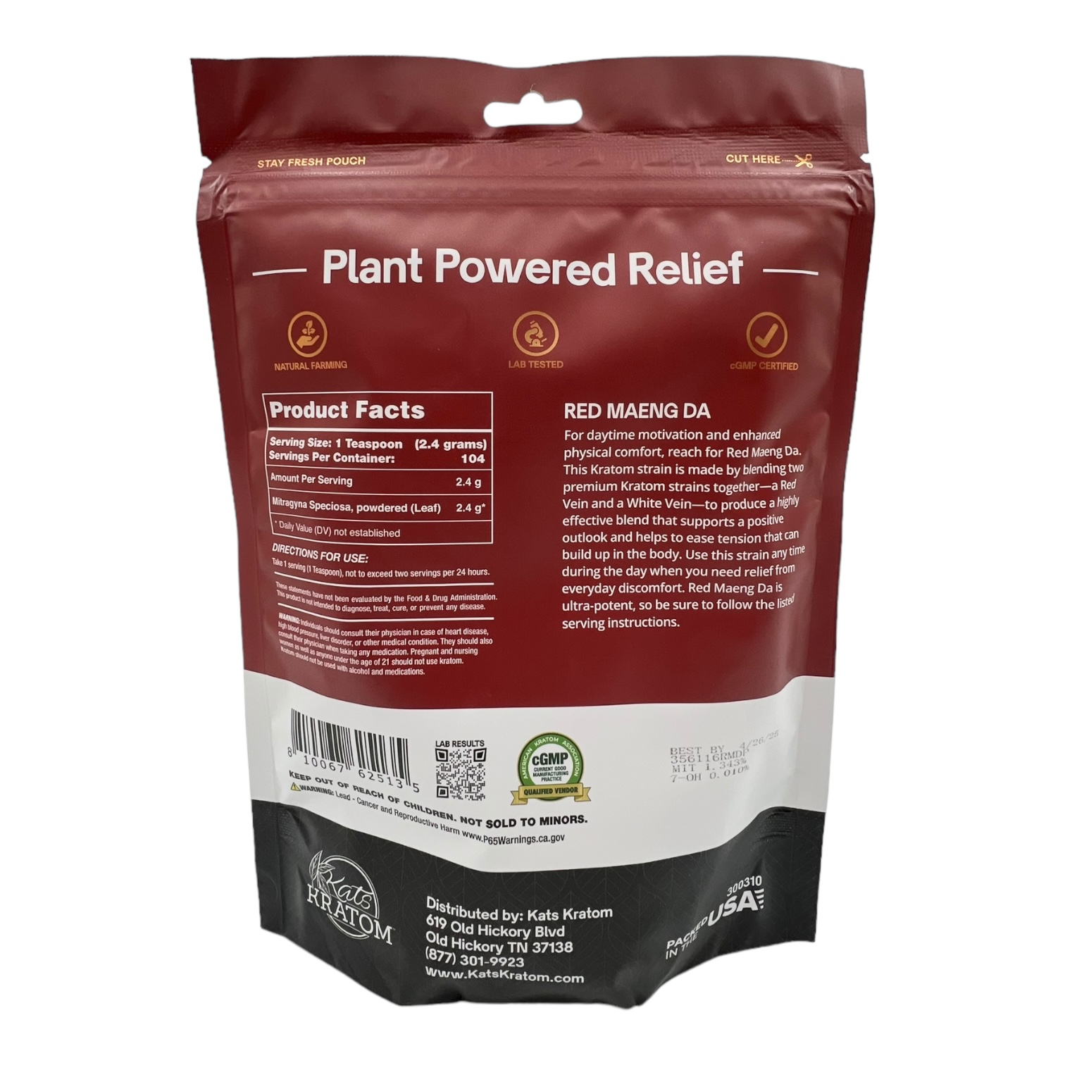 The Kats Botanicals Red Maeng Da Kratom Powder is a signature blend crafted for consistency, balance, and quality. This strain combines 60% Red Vein kratom from Borneo with 40% White Vein kratom from Indonesia’s JongKong region, creating a well-rounded Maeng Da variety that has become a customer favorite.