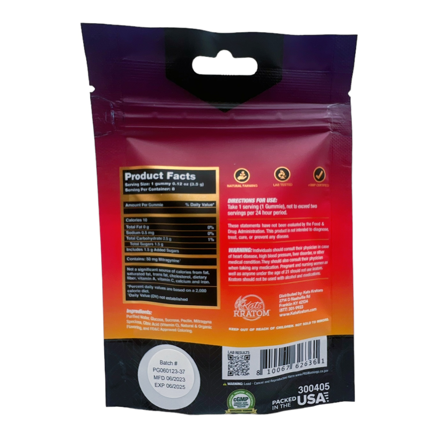 Purified Water, Glucose, Sucrose, Pectin, Mitragyna Speciosa, Citric Acid (Vitamin C), Natural & Organic Flavoring, and FD&C Approved Coloring.