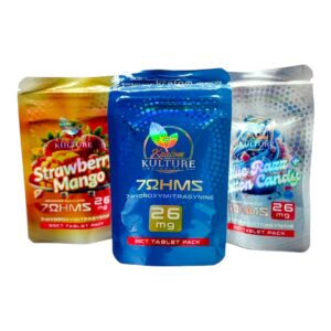 Kratom Kulture 7-OH Tablets are offered as a limited-edition collector’s item. Each tablet is made with 26mg of 7-hydroxymitragynine (7-OH), totaling 780mg per 30-count pack. For variety and cataloging purposes, these tablets are available in three flavors: Blue Razz + Cotton Candy, Original, and Strawberry Mango. All items are intended strictly for research, reference, and collection use only and are not for human consumption.