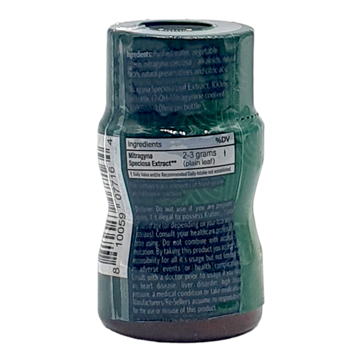 Ingredients: Purified water, vegetable glycerin, Mitragyna speciosa alkaloids, natural flavors, natural preservatives, citric acid