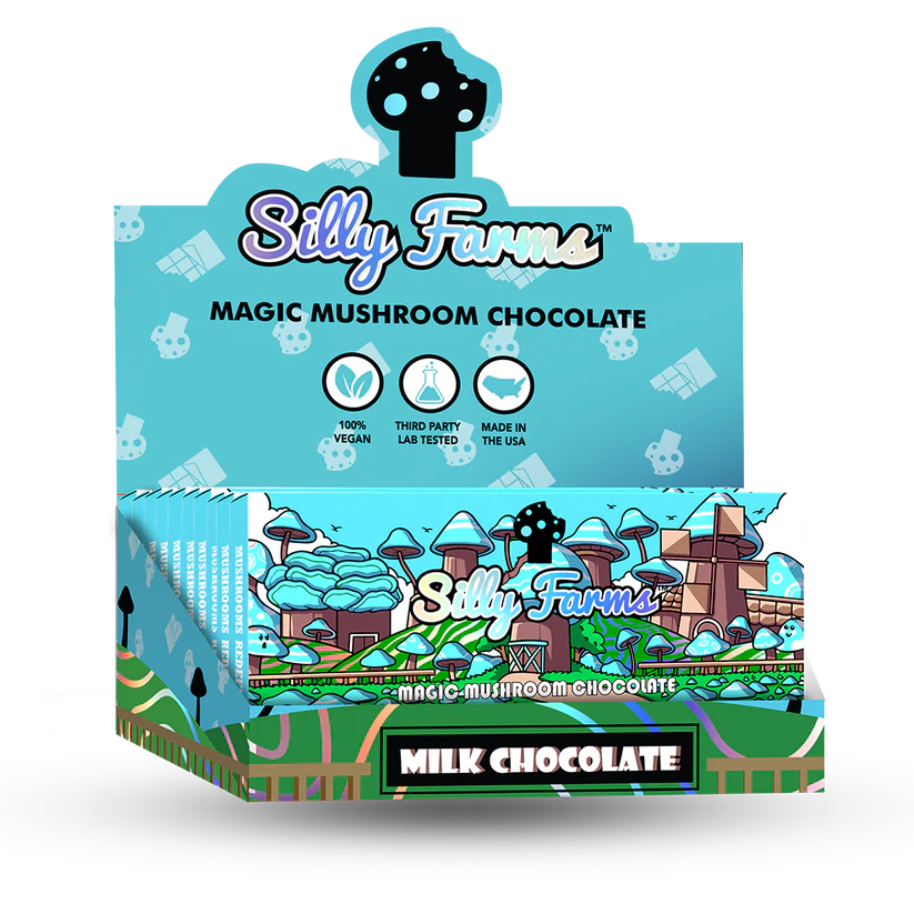 Silly Farms is delighted to present our MILK CHOCOLATE Classic, a celebration of simplicity and perfection. This luxurious chocolate is for those who cherish the classic, creamy taste of premium milk chocolate, elevated with a hint of the extraordinary through the infusion of Amanita Muscaria Muscimol extract. Our MILK CHOCOLATE Classic is a tribute to the art of chocolate making, offering a rich, velvety experience that soothes the soul and delights the senses.
