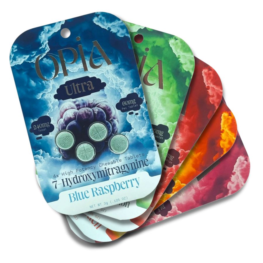 OPiA Ultra 7-OH Flavored Tablets – 60mg x 4ct provide a concentrated extract option in a chewable, portable format. Each pack contains four tablets with 60mg of 7-hydroxymitragynine per tablet, offering a pre-measured and convenient alternative to powders, capsules, or liquids.