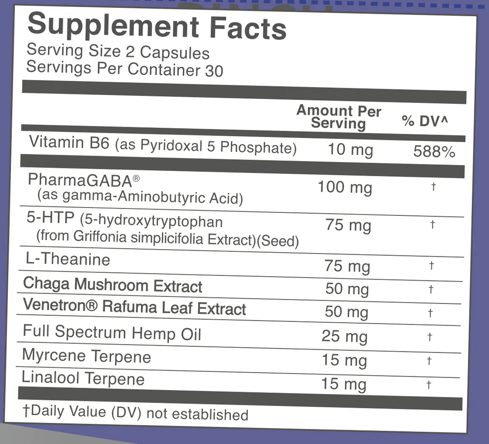 - Other Ingredients: Chaga mushroom, Venetron® extract (Apocynum venetum), PharmaGABA®, 5-HTP, L-Theanine, Vitamin B6, vegan capsule