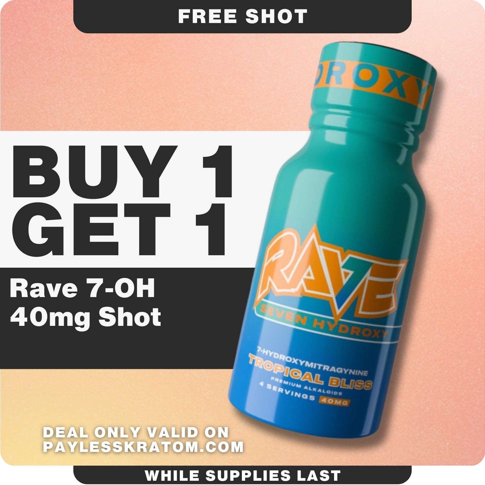 The Rave Kratom 7-Hydroxy Shot Tropical Bliss delivers a potent 40mg of 7-hydroxymitragynine in a compact, ready-to-drink format. Designed for convenience and fast use, this liquid extract makes it easy to enjoy your kratom without the hassle of powders or capsules.