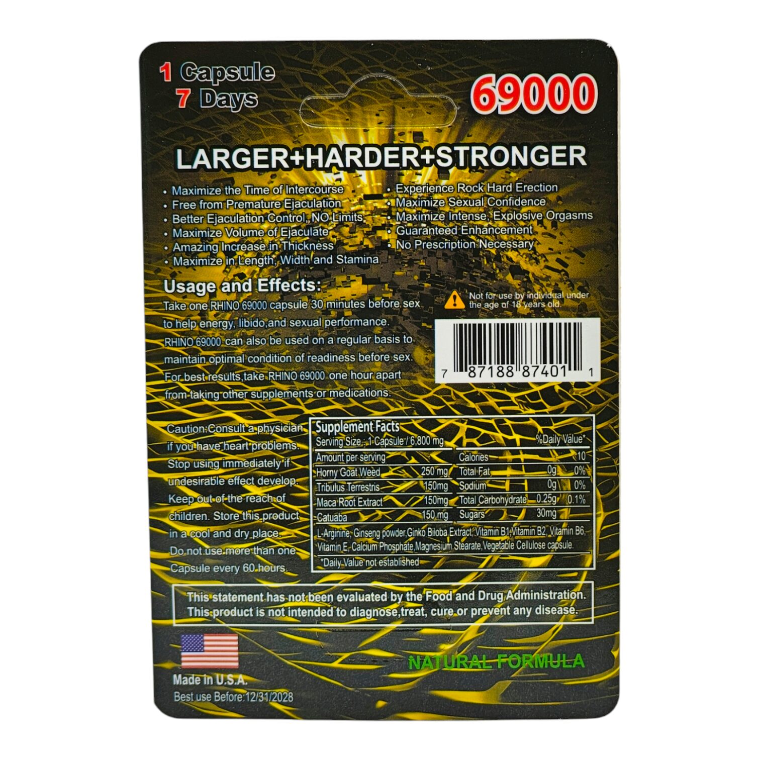 Experience the powerful effects of Rhino 69000, the male enhancement capsule designed to maximize size, stamina, and sexual confidence. This long-lasting supplement helps you achieve larger, harder, and stronger results, enhancing libido and performance for up to 7 days—all without the need for a prescription.