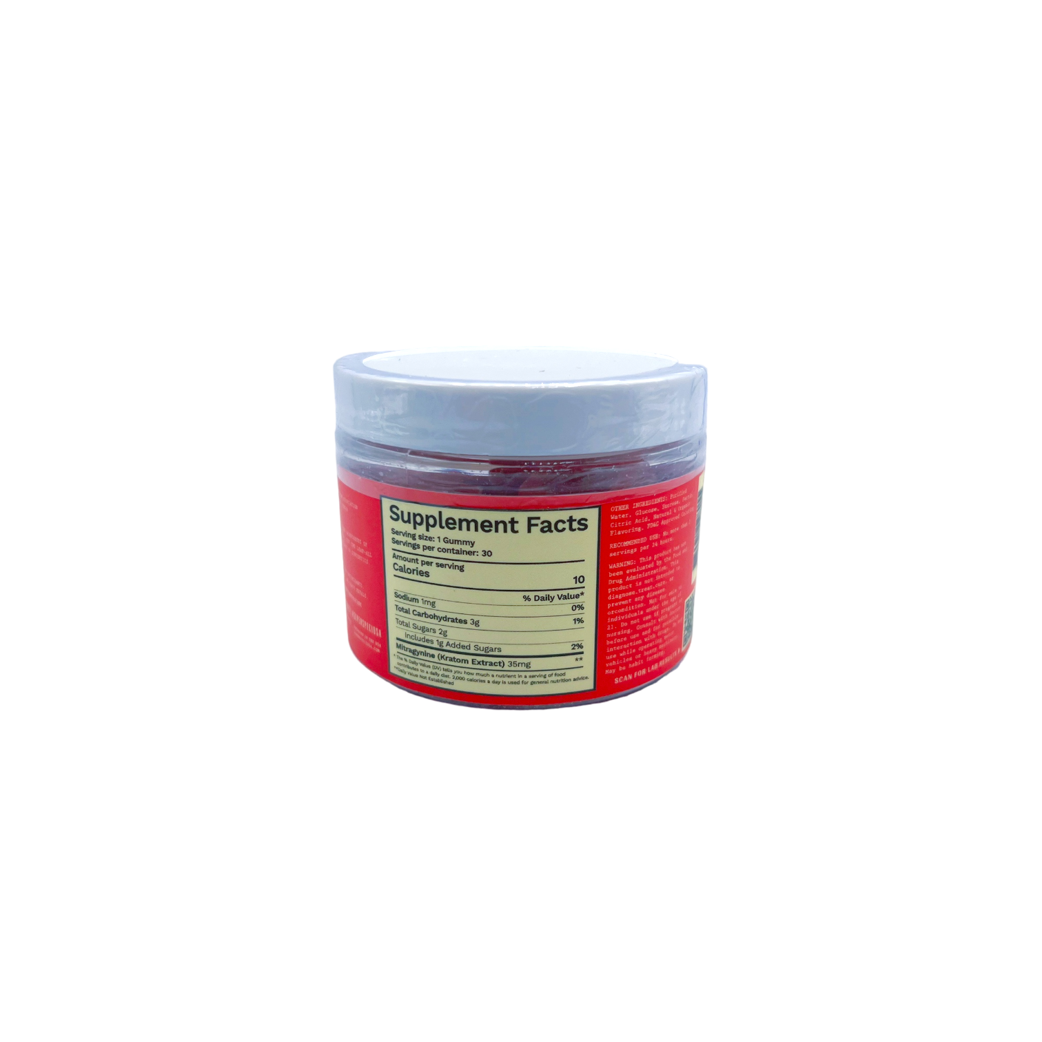 Strawberry Kratom Gummies Ingredients: Kratom Extract, Purified Water, Glucose, Sucrose, Pectin, Citric Acid, Natural and Organic Flavoring, FD&C Approved Coloring.