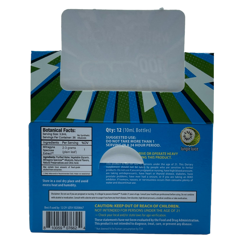 Ingredients: Purified Water, Vegetable Glycerin, Mitragyna Speciosa Alkaloids, Natural Flavors, Natural Preservatives, Citric Acid