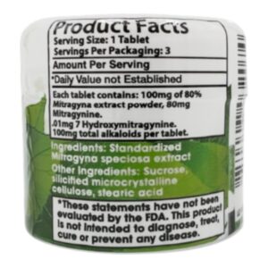 Ingredients: Mitragyna speciosa extract (80% Mitragynine, proportional naturally occurring alkaloids)